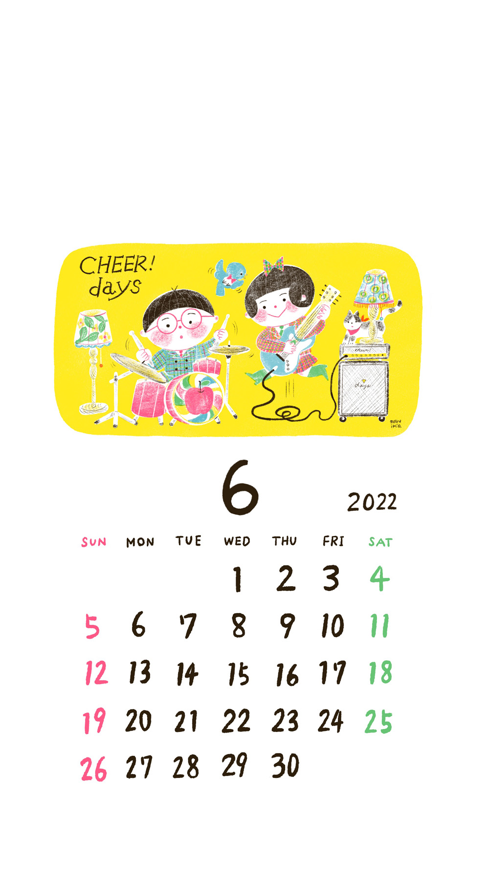 オリジナルカレンダーを描き下ろしてくださっているのは、福岡県嘉麻市在住のイラストレーター・maruiko(まるいこ)さん。今月は6月9日のロックの日にちなんで、ロックバンドを組んだチアちゃん&デイズくんです。チェックのスーツに身を包んでノリノリの2人に、ぴーちゃん、フクちゃんも羨ましそう~。