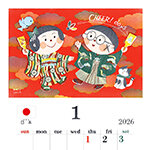 さて、今月の民族衣装は「日本」です。羽子板遊びを楽しむチアちゃんたち。背景に描かれているのは“雲取り”と呼ばれ、良いことが起こる前兆(瑞祥)や豊穣などを意味する伝統的な模様です。