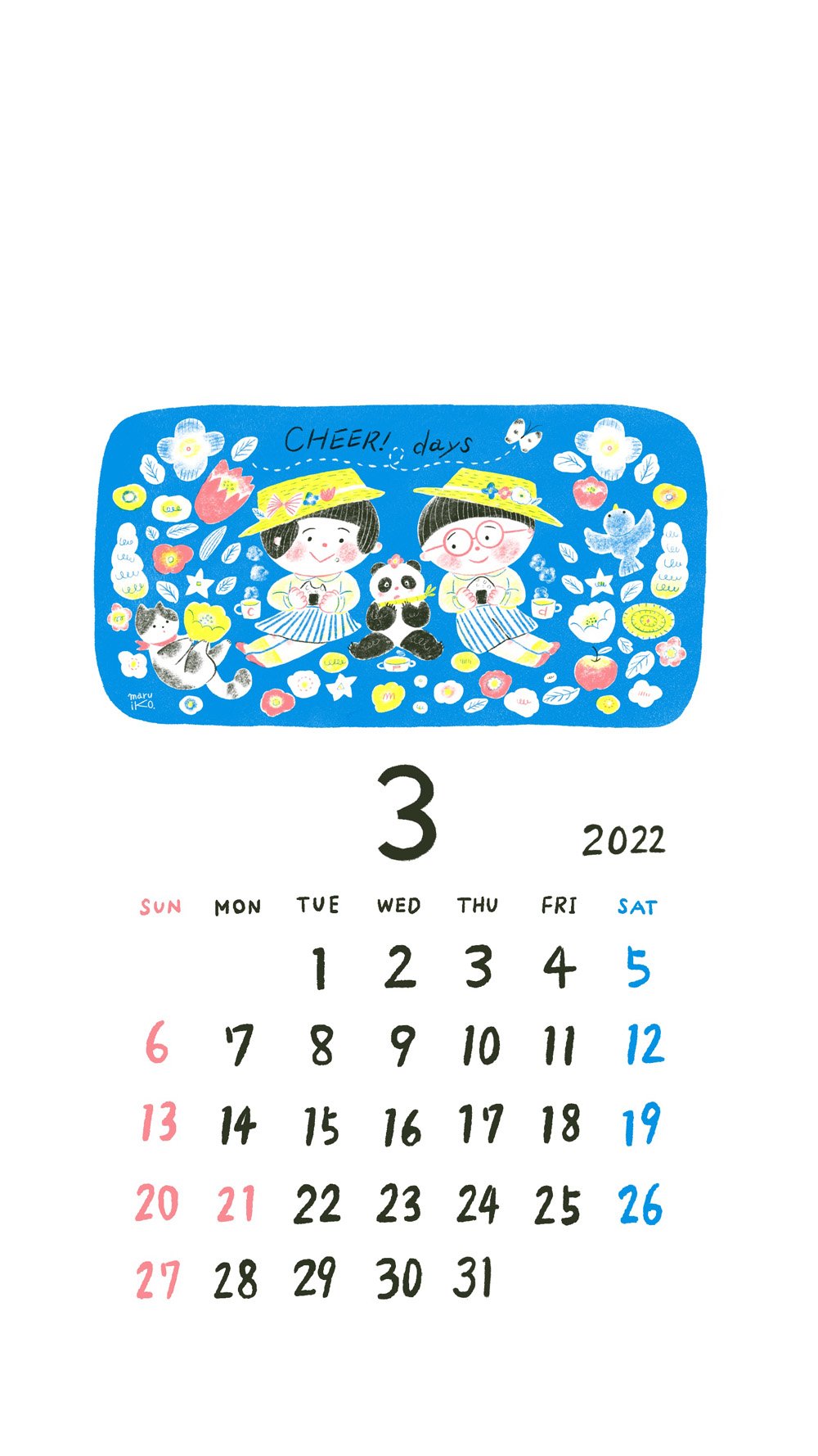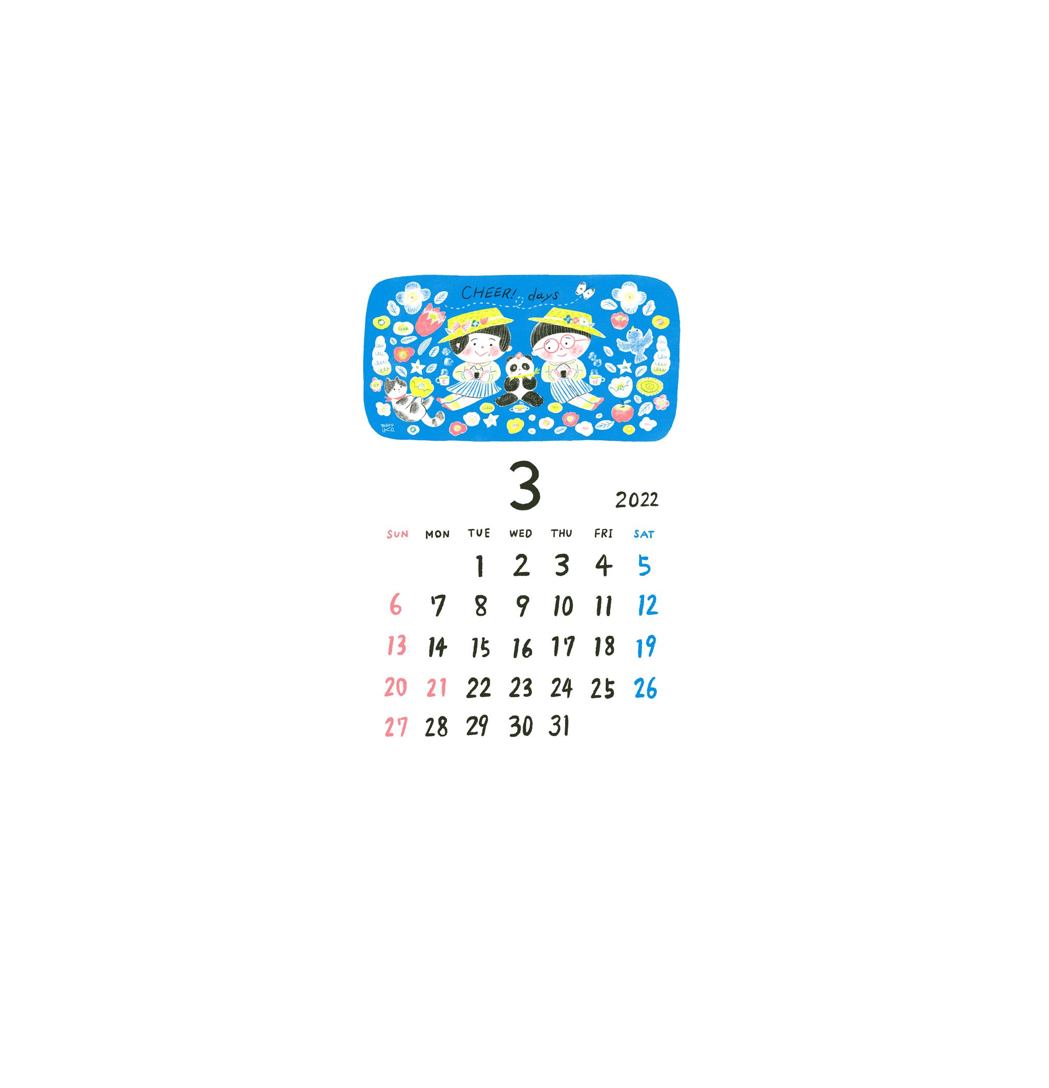 オリジナルカレンダーを描き下ろしてくださっているのは、福岡県嘉麻市在住のイラストレーター・maruiko(まるいこ)さん。今月のテーマは、3月11日がパンダの日ということで、パンダと一緒に春のピクニックを楽しんでいるチアちゃんたちです。お花畑で食べるおにぎり、とっても美味しそうですね♪